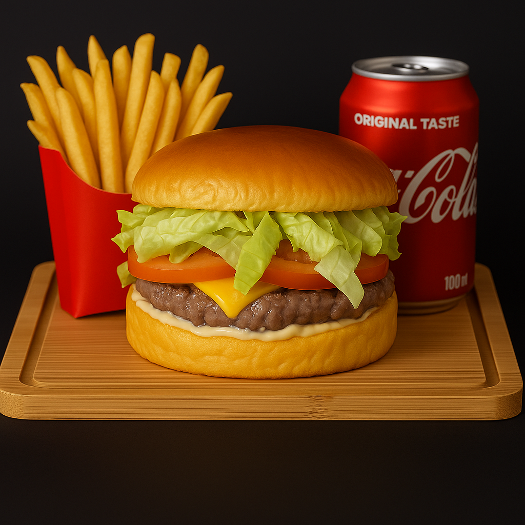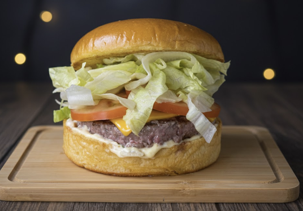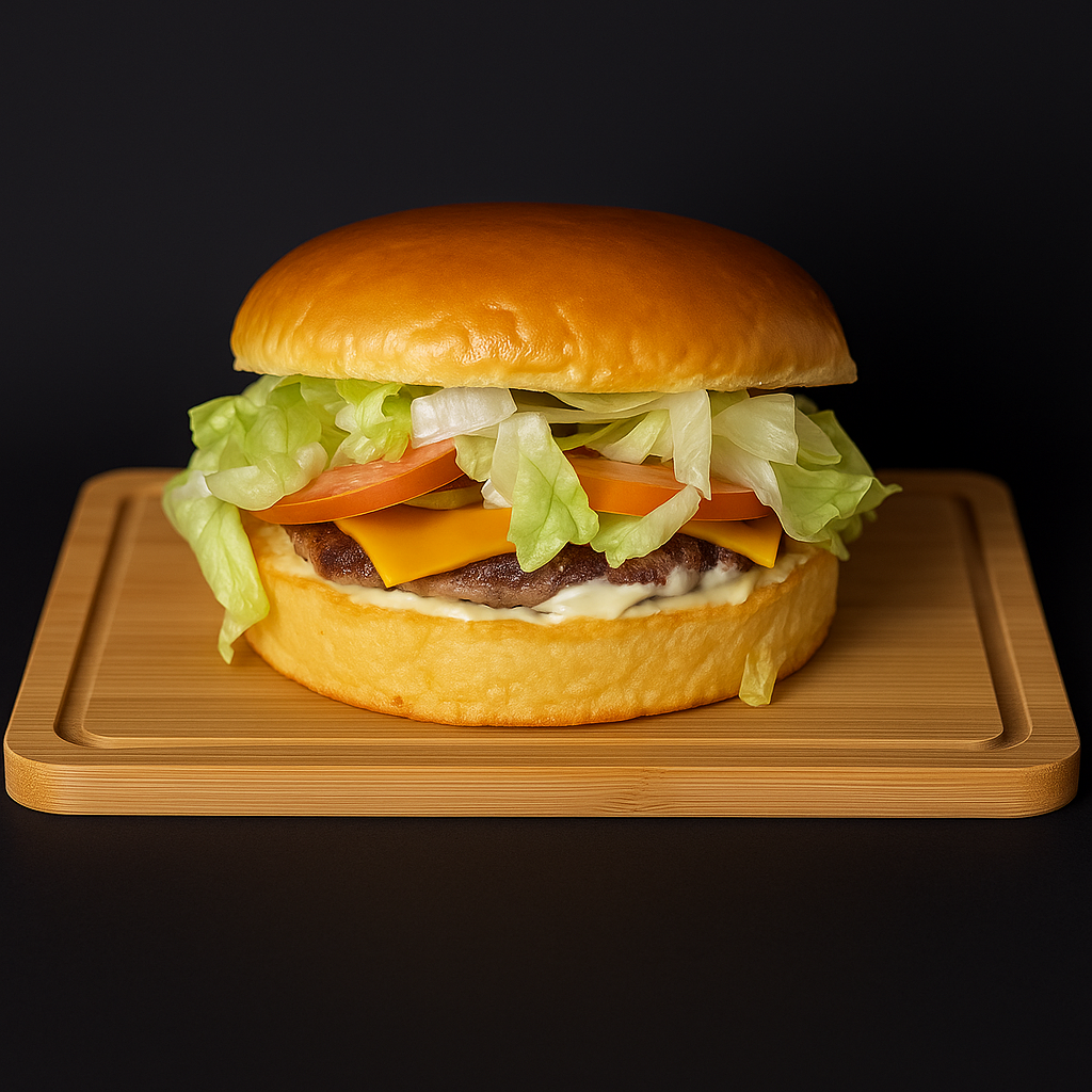 Pão de Brioche, Hambúrguer de 150g, Queijo Cheddar em Fatia, Alface, Tomate, Maionese da casa. Imagem ilustrativa.