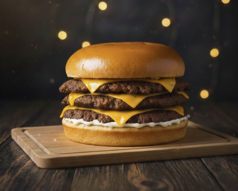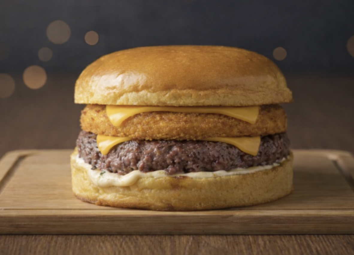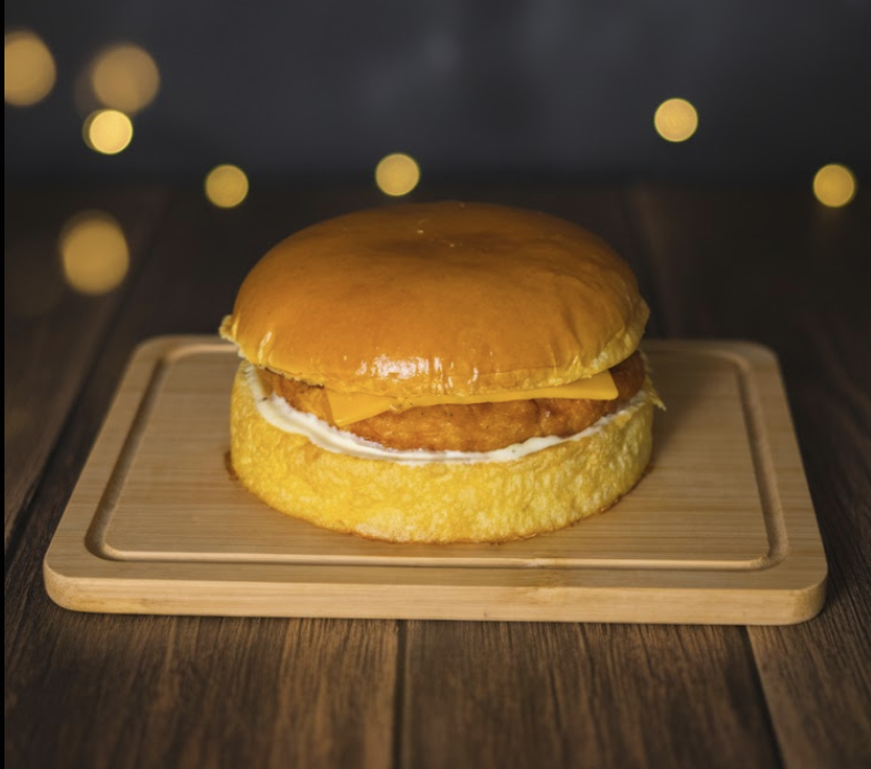 Pão de brioche, Hamburguer de 150g, queijo cheddar fatiado, hamburguer de queijo empanado e maionese da casa. Imagem ilustrativa.