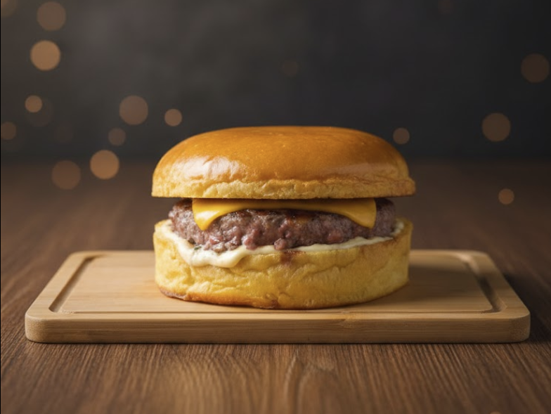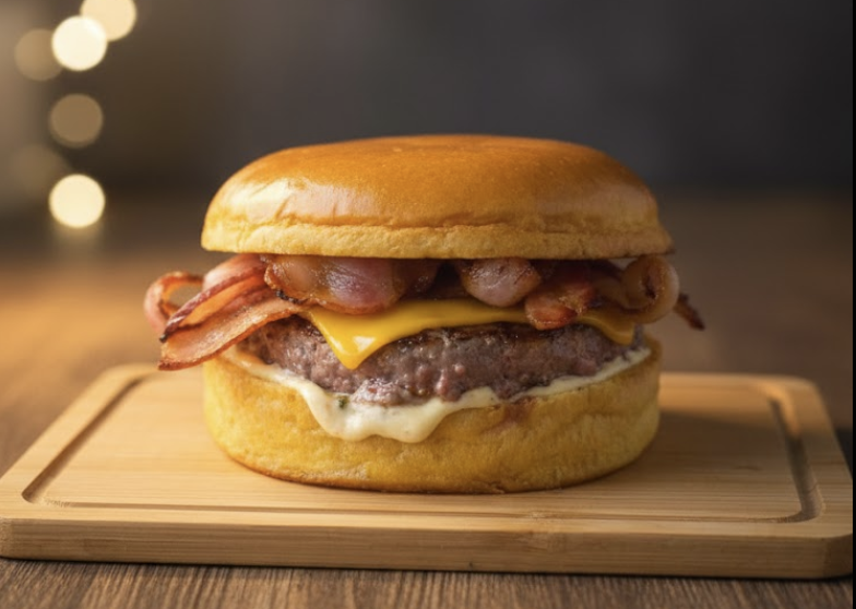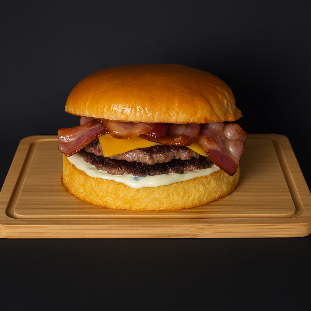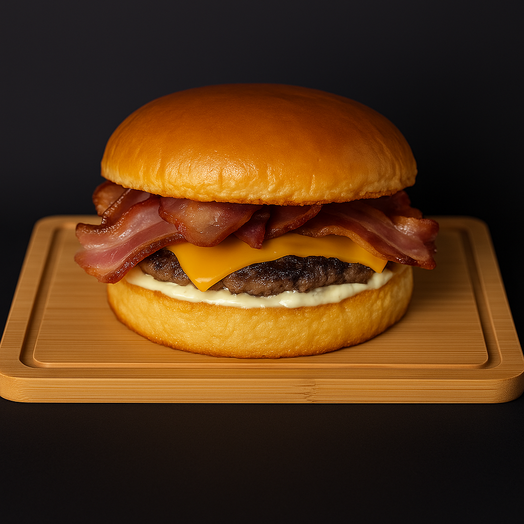 Pão de Brioche, Hambúrguer de 150g, Queijo Cheddar em Fatia, Bacon, Maionese da casa. Imagem ilustrativa.