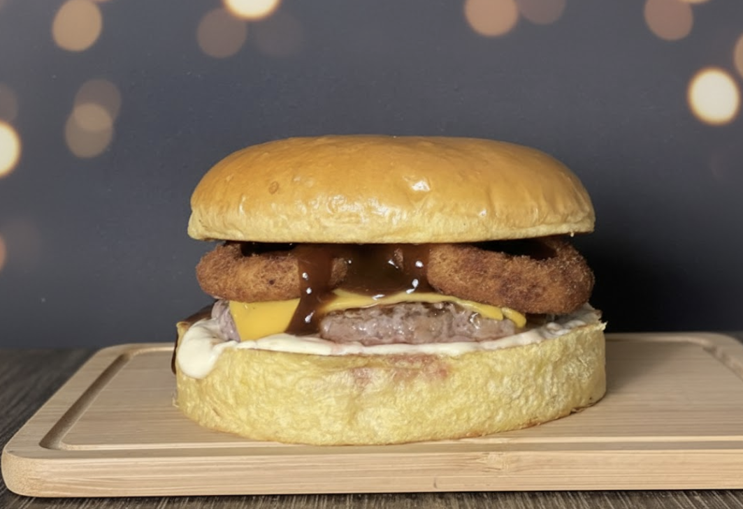Pão de Brioche, Hambúrguer de 150g, Queijo Cheddar em Fatia, 3 Onion ring, Barbecue, Maionese da casa. Imagem ilustrativa.