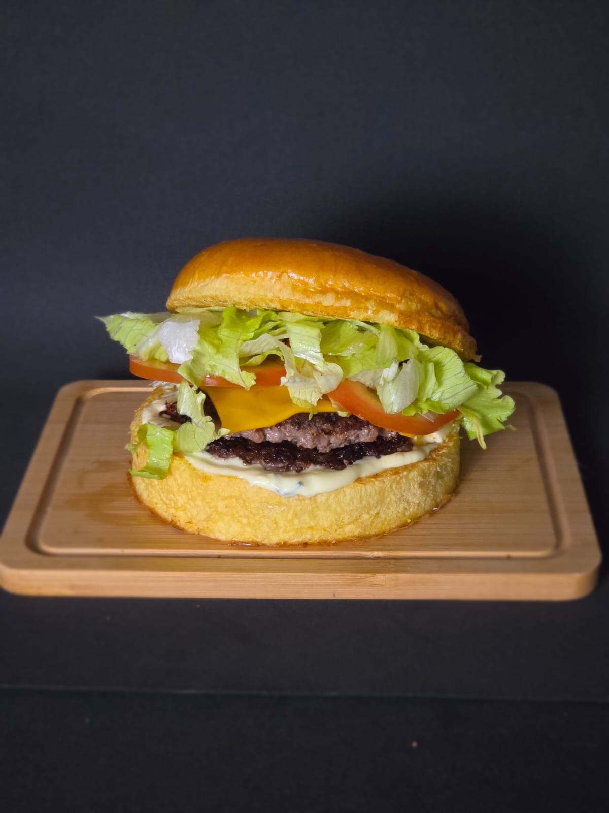 Pão de brioche, Dois Smash de 70g (140g no total), Queijo Cheddar Fatiado, Alface Americana, Tomate fresco selecionado e nossa exclusiva maionese artesanal. Imagem ilustrativa.