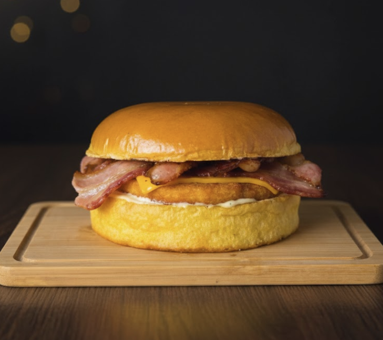 Pão de Brioche, Hambúrguer de Frango empanado de 100g, Queijo Cheddar em Fatia, Bacon, Maionese da Casa. Imagem ilustrativa.
