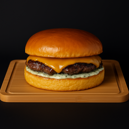 Pão de brioche, Hamburguer de 150g, queijo cheddar fatiado e maionese da casa. Imagem ilustrativa.