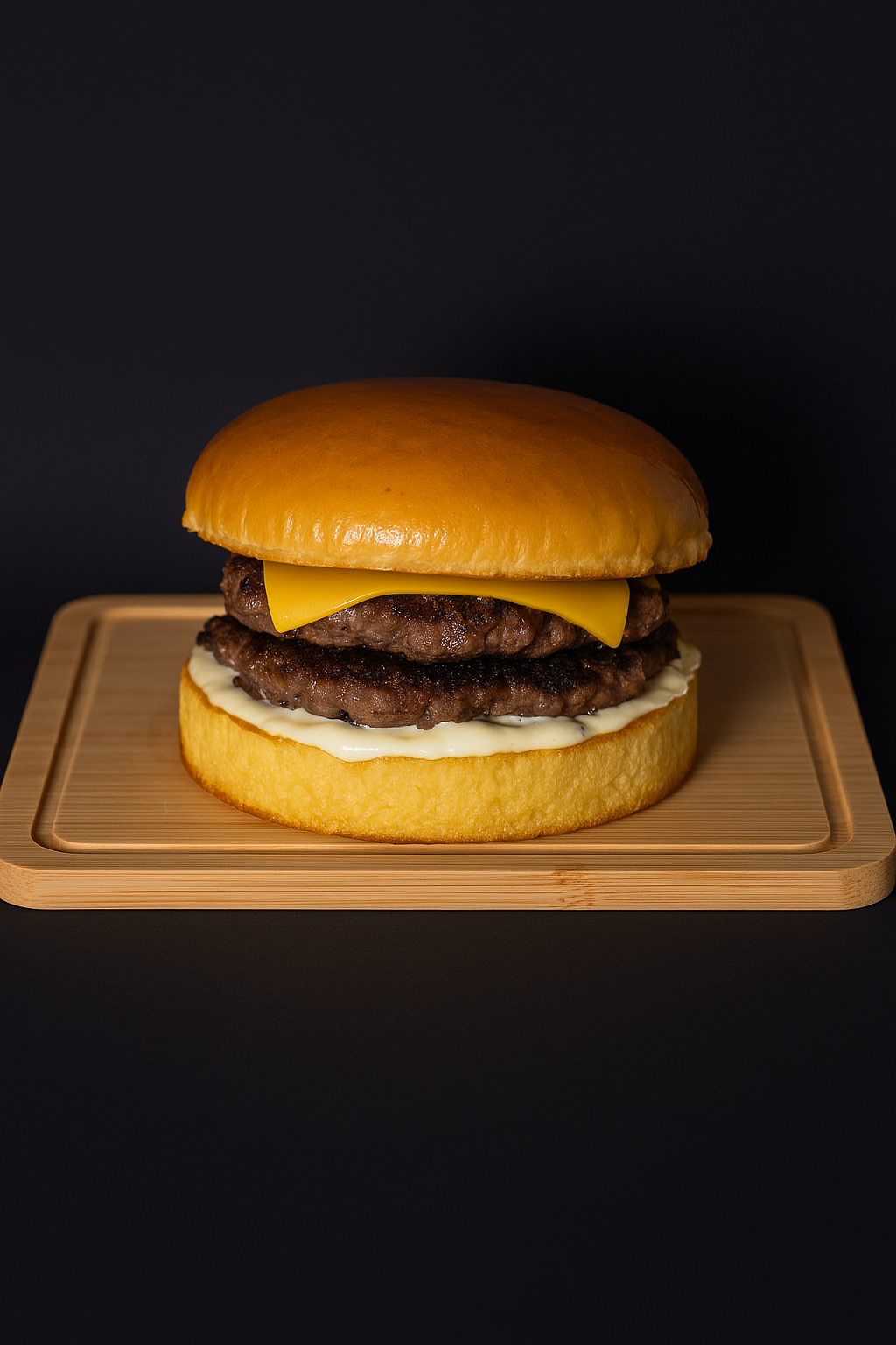 Pão de brioche, Dois Smash de 70g (140g no total), Três Fatias de Cheddar Fatiado e Maionese da casa. Imagem ilustrativa.