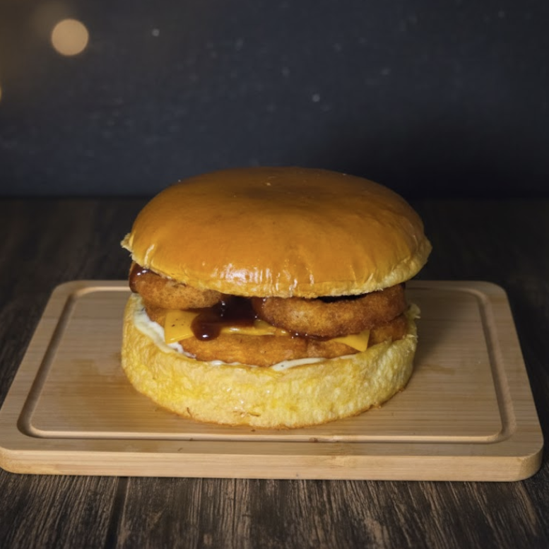 Pão de Brioche, Hambúrguer de Frango empanado de 100g, Queijo Cheddar em Fatia, 3 Onion ring, Barbecue, Maionese da casa. Imagem ilustrativa.