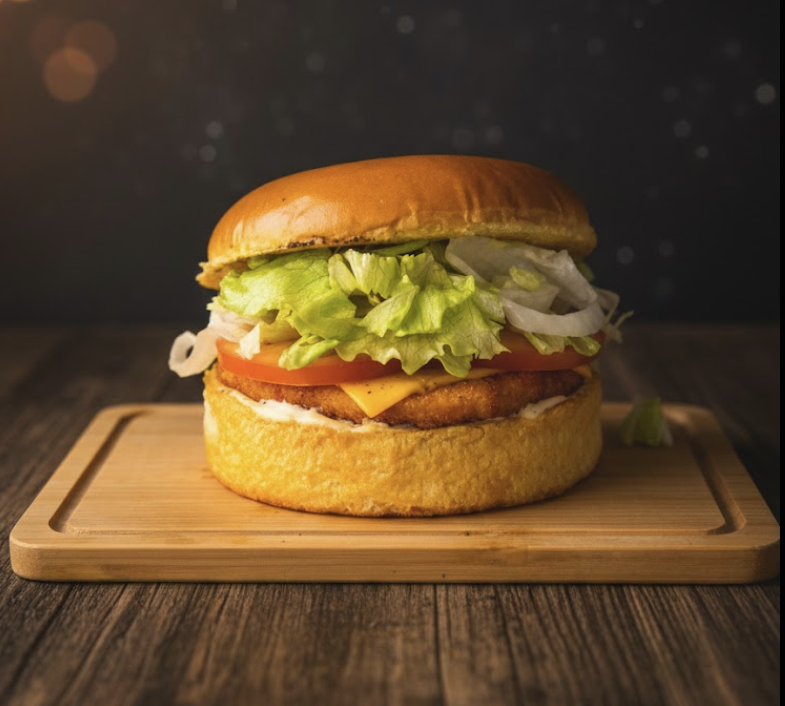 Pão de Brioche, Hambúrguer de Frango empanado de 100g, Queijo Cheddar em Fatia, Maionese da casa. Imagem ilustrativa.